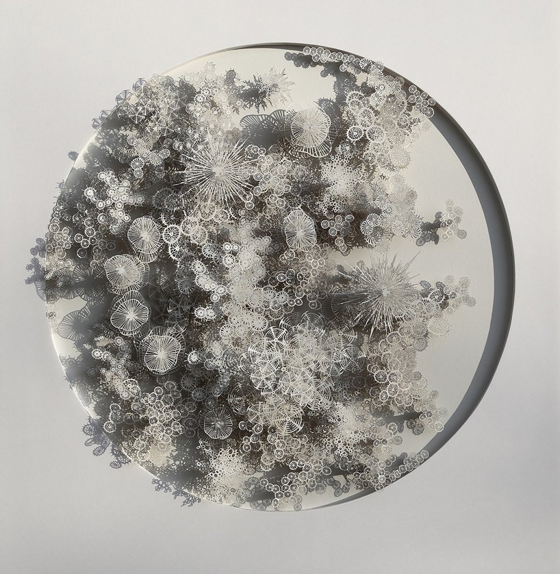 布朗极力寻找各种微生物和有机结构如细胞结构,微生物,贝壳和化石之间的美学平行。在他的最新展览中,布朗的作品以细菌形状的海洋粉彩色,层状纸切割为特色,其细节构成了石珊瑚,海葵和微小海洋物种等水下生态系统。