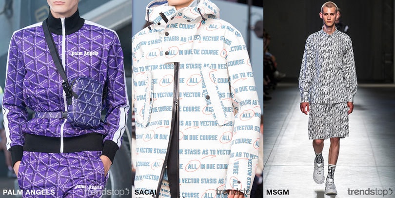 不管是低调,还是醒目的图案,文字成为印花图案的主角,传递着反传统,或是恶搞的信息。不同于以往几季高调的品牌营销模式,本季采用幻觉感的,全幅重复文字的图案,让使用文字的品牌营销再次回归。