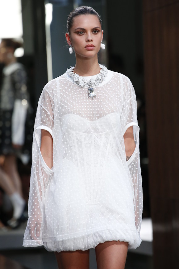 经典的风衣被演绎得相当保守,动物纹的加入也可能是上一辈消费者会喜欢的样式。但经典格纹则被玩出了新花样,有真丝衬衫,也有编织外套。到了秀的后半部分,蕾丝、皱褶和花边又出现了,Riccardo Tisci可能还想在年轻人中圈一波粉。另外,Riccardo Tisci为Burberry设计的新印花也出现在面料上。