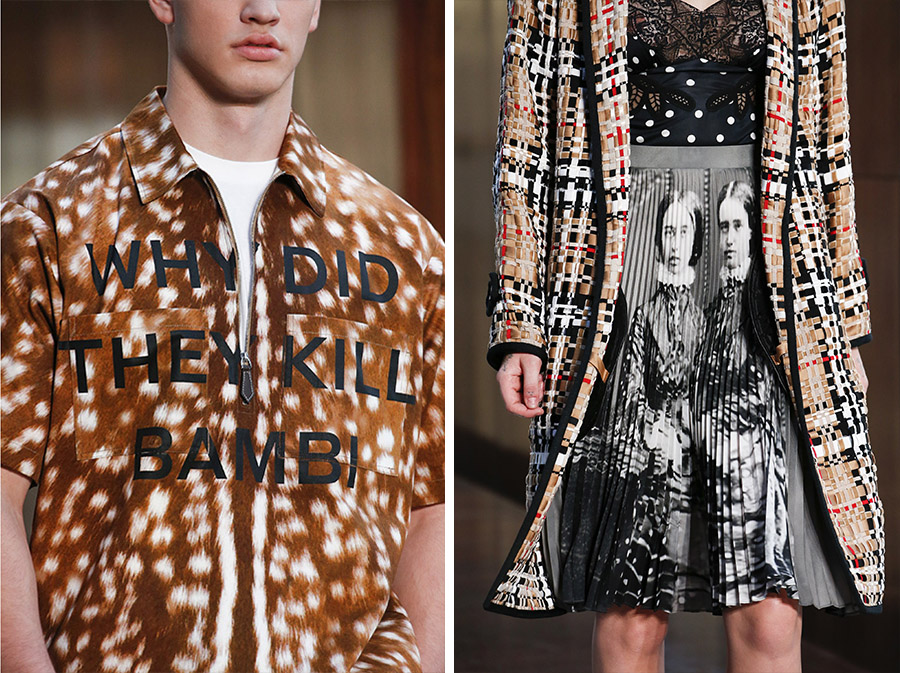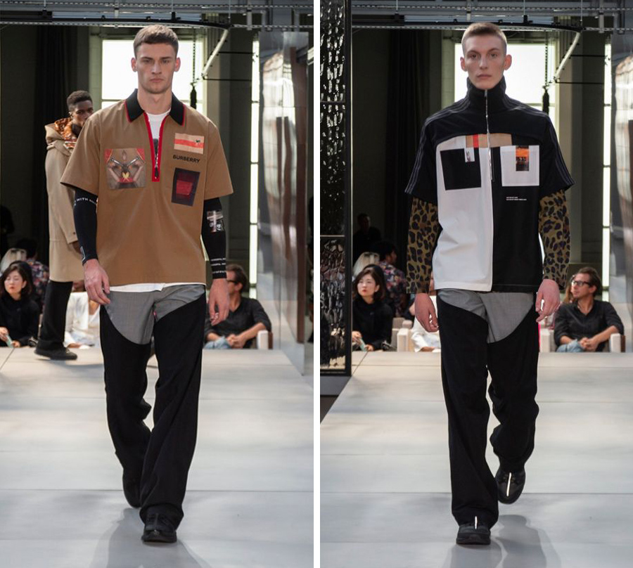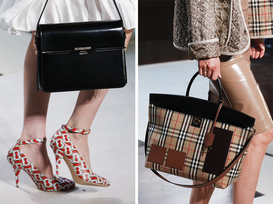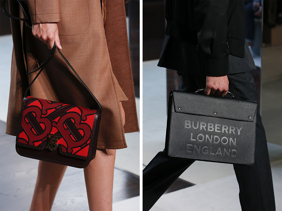 TB Monogram、经典的格纹、品牌创始人的照片、街头化的 Slogan、朋克风的金属等等元素都有,但也都没有过于密集或者放大的呈现。正因为没有刻意的强调,让观众不自觉地更加专注和敏感地去欣赏。Monogram 图案覆盖的一双高跟鞋、金属环镶边的一件风衣、格纹的手袋、照片印花的领带、街头风的腰包、穿在西装里面的 Slogan 印花 T 恤,在这些设计里都刻着鲜明的设计师印记与品牌印记。