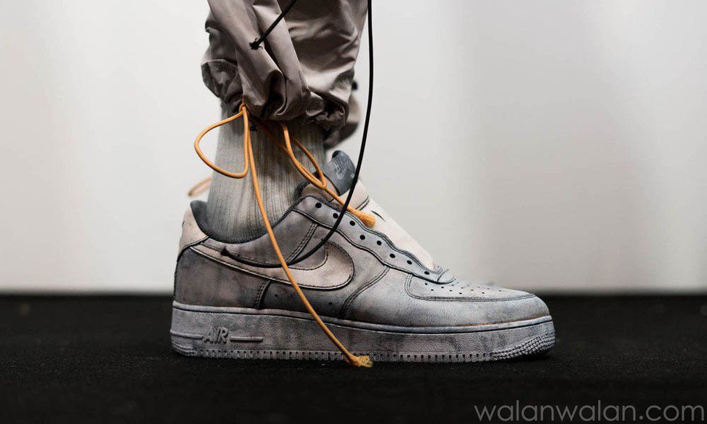 早在去年品牌在伦敦秋冬男装周带来的 17 秋冬系列首次走秀上,Samuel Ross 与 Nike 的首次碰撞就已经亮相,一双去掉了大部分的鞋带孔、编织鞋标,改用针孔替代 Swoosh 皮片的 Air Force 1 呈现在大家眼中。