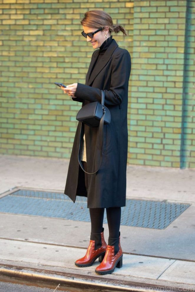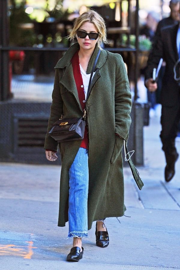 墨绿色大衣与酒红色开衫大玩撞色搭配,牛仔裤和吸烟鞋轻松穿出不费力的时髦感。