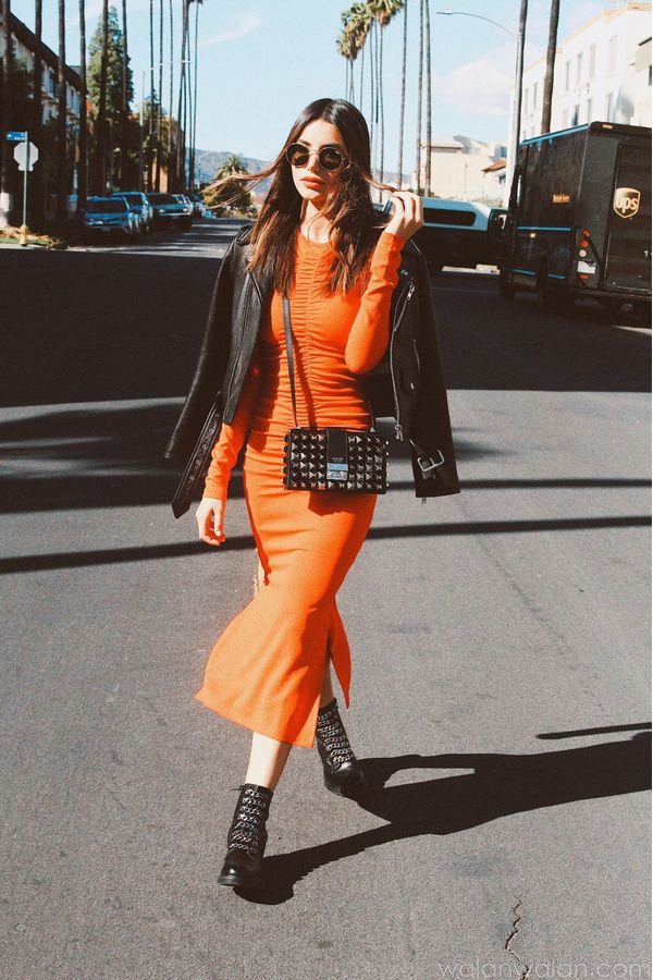 橙色抽褶连衣裙搭配小皮衣,包包和短靴的铆钉链条元素以及墨镜的融入,使得整体风格酷酷的,但又不失温柔。