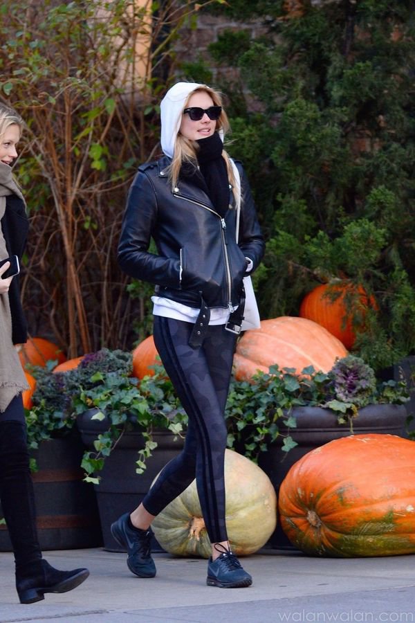 小皮衣内搭白色卫衣,迷彩暗纹紧身裤配上Nike运动鞋,是超模出街非常钟爱的休闲风穿搭。