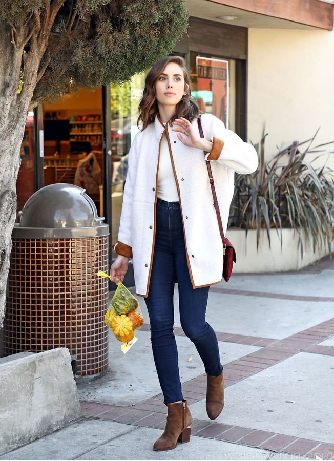 白色针织打底衫搭配牛仔裤和棕色麂皮靴,外搭驼色边饰白色摇粒绒大衣,暖暖的秋日色调更显温柔干净的气质。