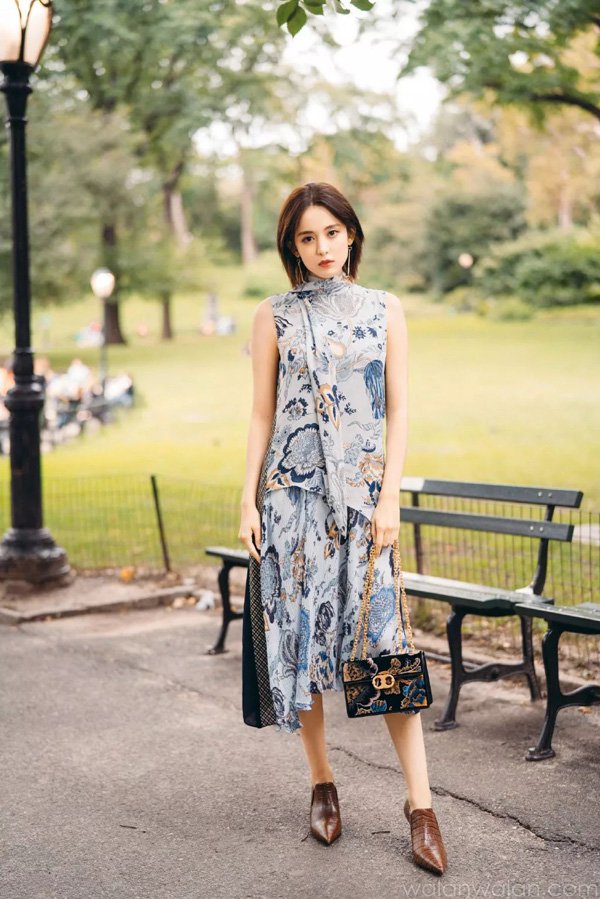 更温婉的可能像娜扎这样,丝巾和连身裙同款印花,也不会出错。