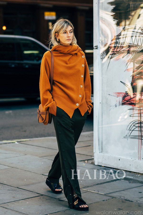 这件柿子色斜纽扣式的毛衣刚过去的时装周街拍成了时髦精的团宠,时尚博主卡米尔·夏里埃尔(Camille Charriere) 、Net-a-porter零售时尚总监&《THE EDIT》造型总监Lisa Aiken等不约而同得演绎了。
