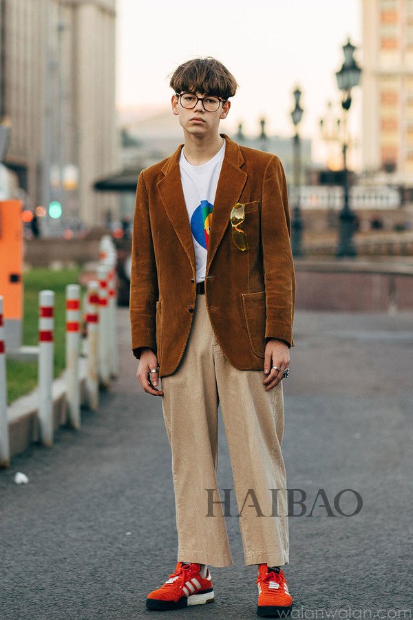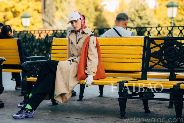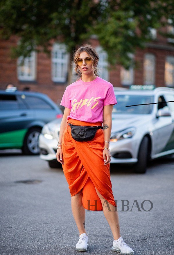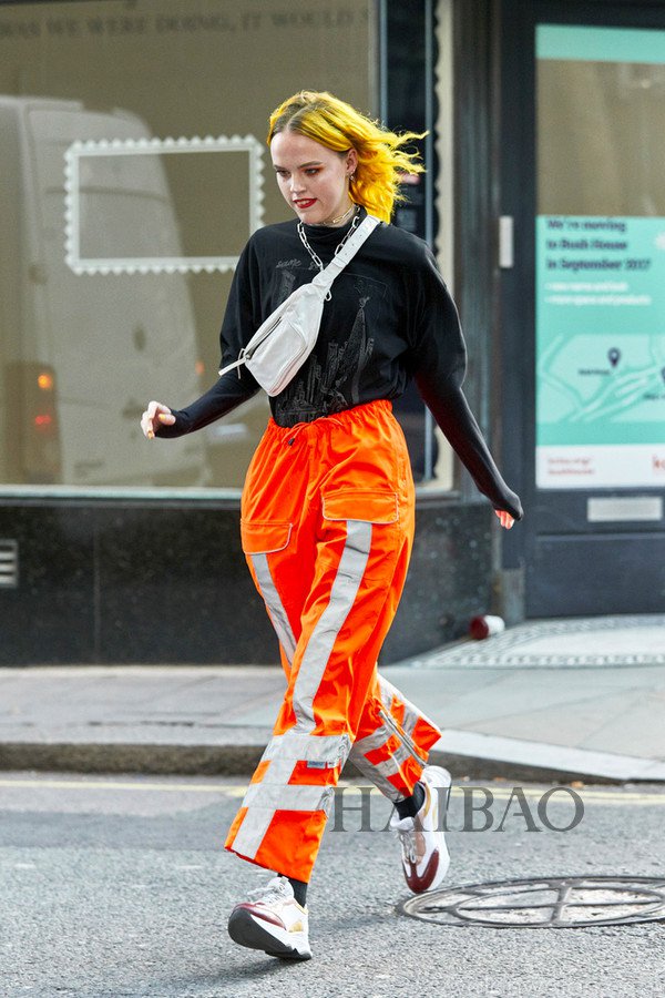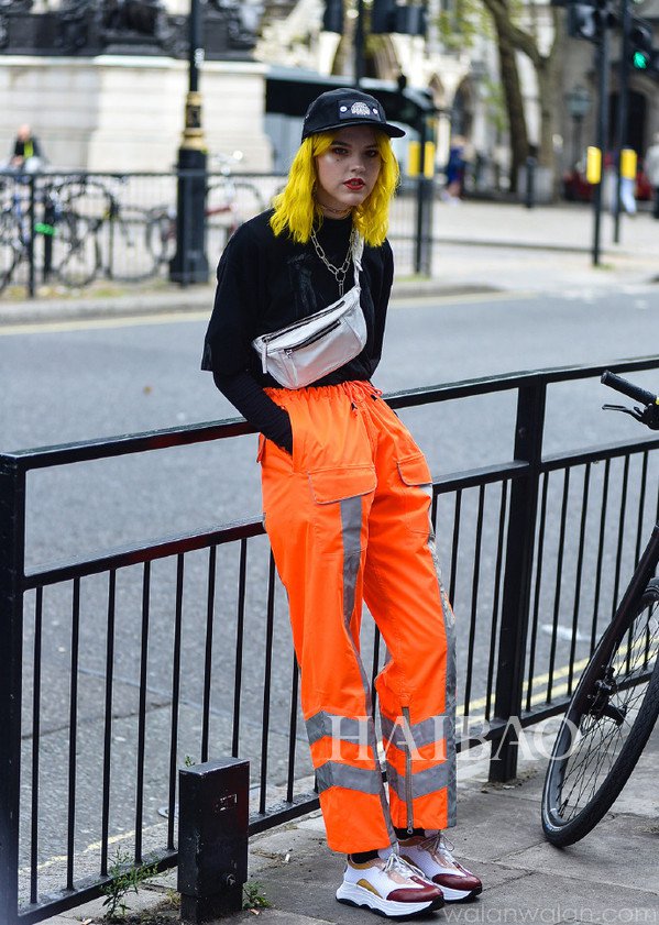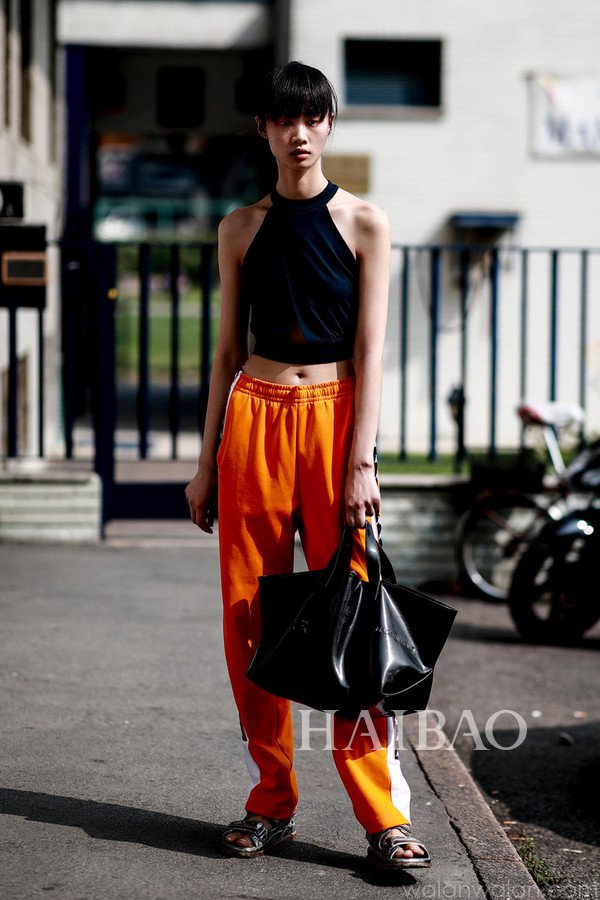 偏荧光的柿子色貌似也出现率颇高,大部分都是以运动裤的形式,工装裤风格的运动裤是街头酷女孩的必备,显眼的颜色也让她们更加潮了。