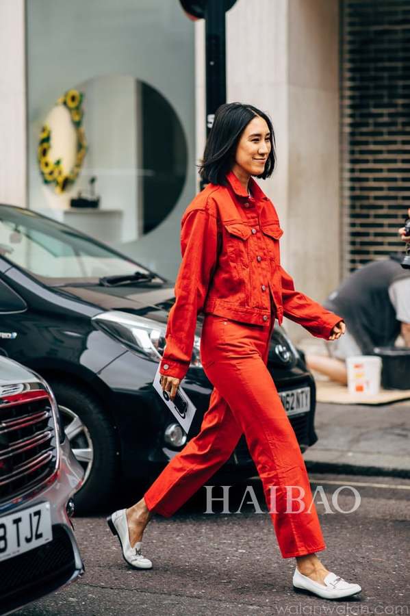 除了花心思搭配,柿子色还可以“不用脑”的按套装穿,除了型人们爱的西服套装,看Eva Chen这身红柿子色牛仔套装,多青春又休闲随意呀。