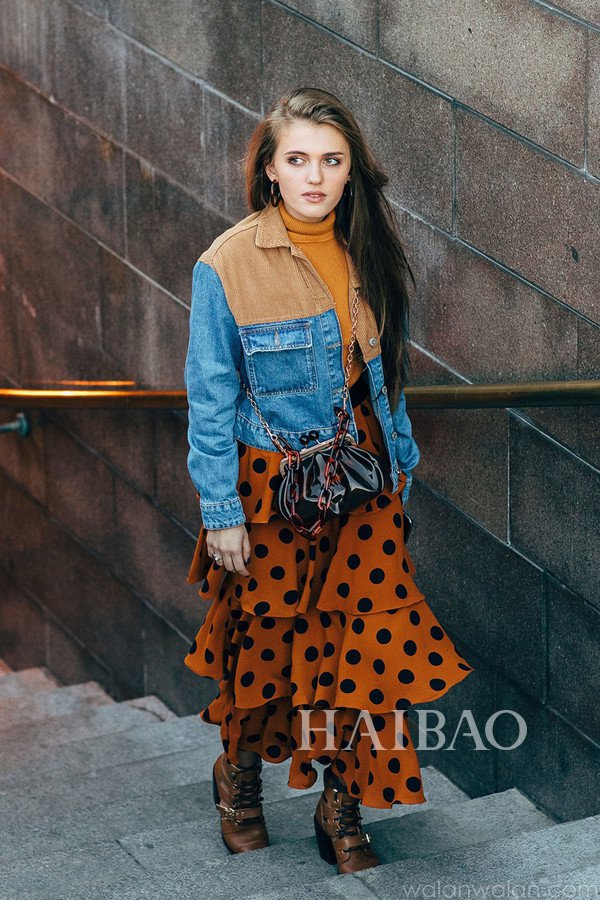 实穿性高且不易出错的柿子色毛衣你就可以试试。高领衫温暖洋气,搭配上牛仔这个大IP,鲜艳色系也能轻松驾驭,撞上复古的波点裙,活脱脱一个都市女郎。