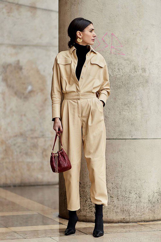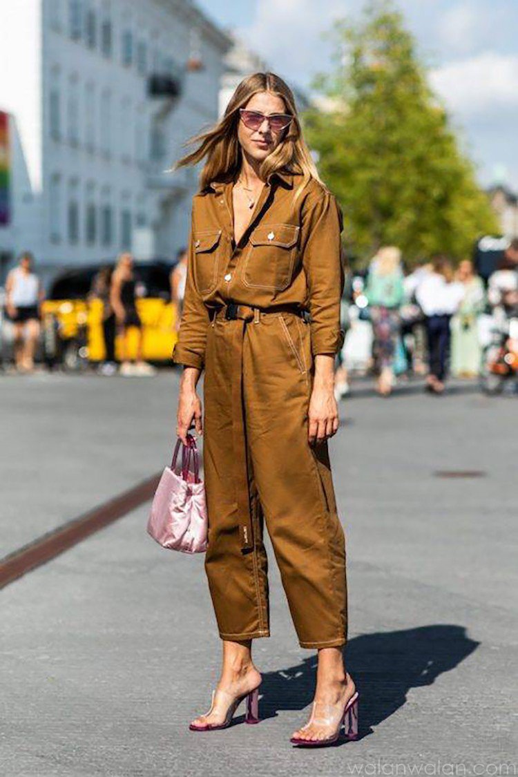 今年也有很多潮人喜欢穿这种连体工装,大家喜欢在工装里面搭配一件打底衫,增加整个造型的层次和细节,搭配上夸张的耳饰,看上去更时髦。