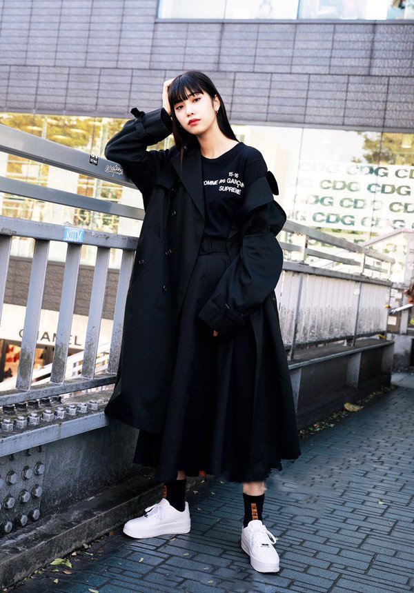 用黑色风衣配Comme des Garcons的字母卫衣和小白鞋体现潮流精神。