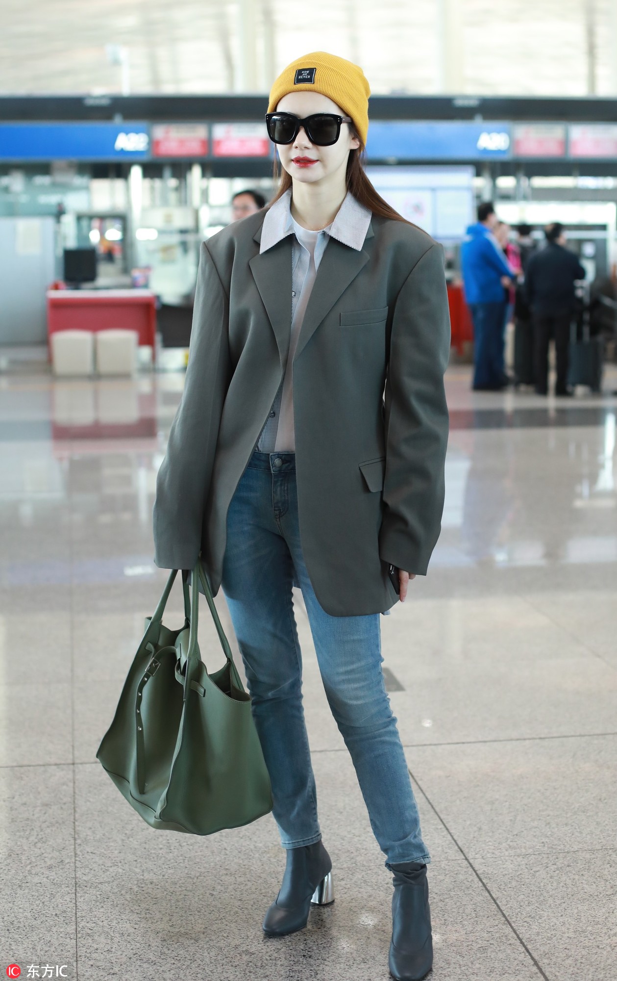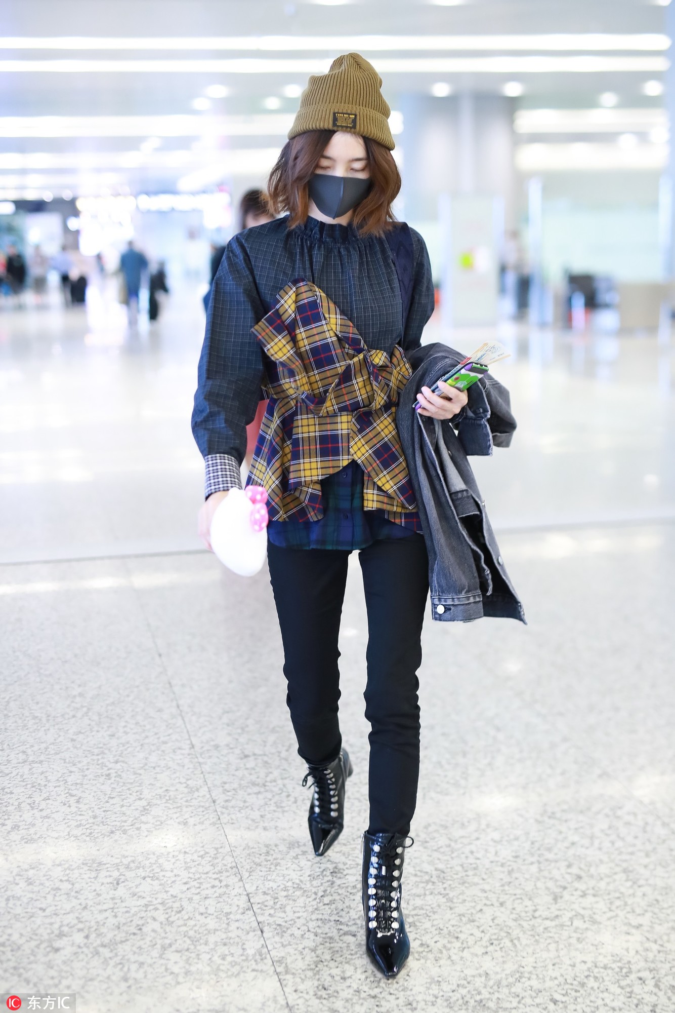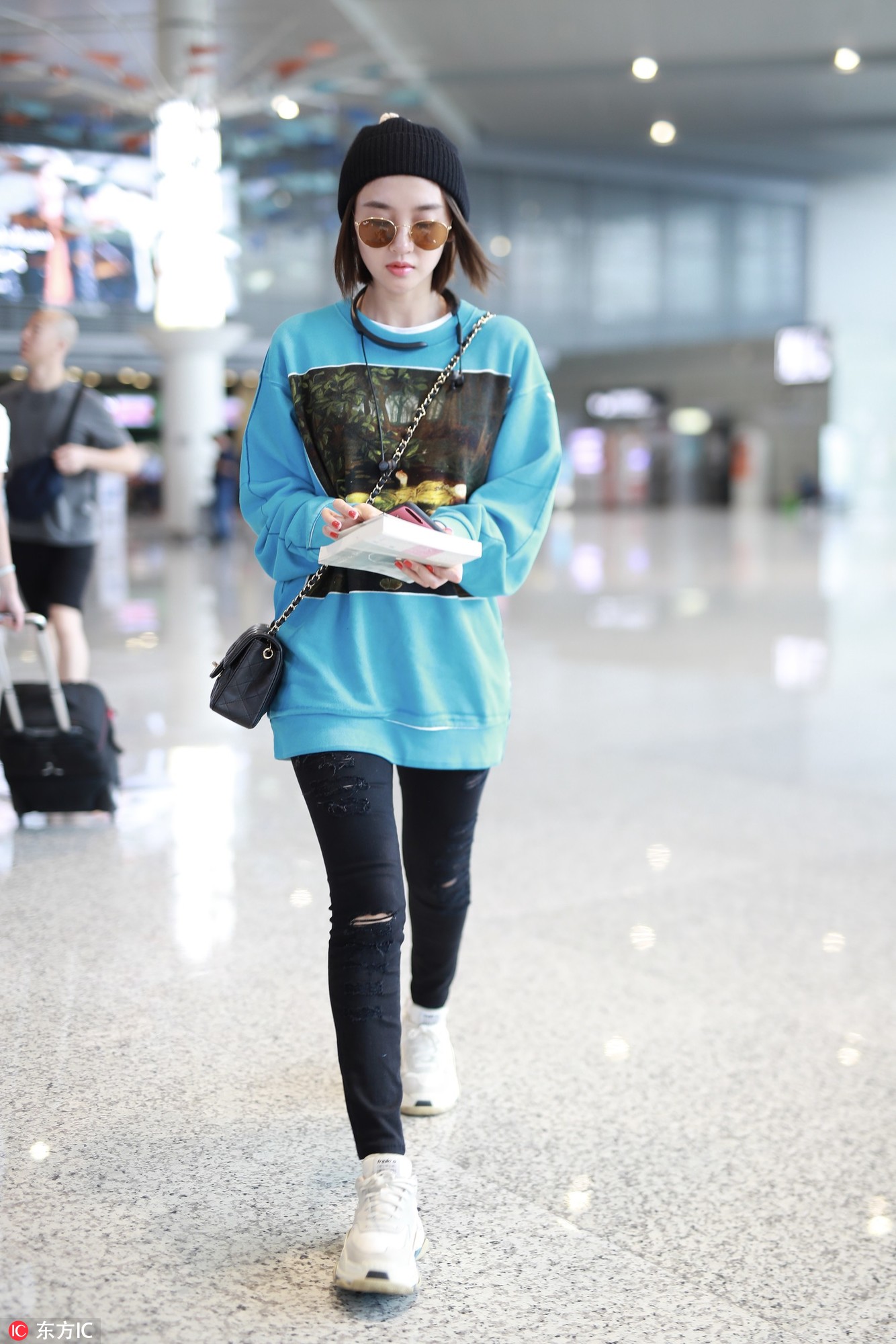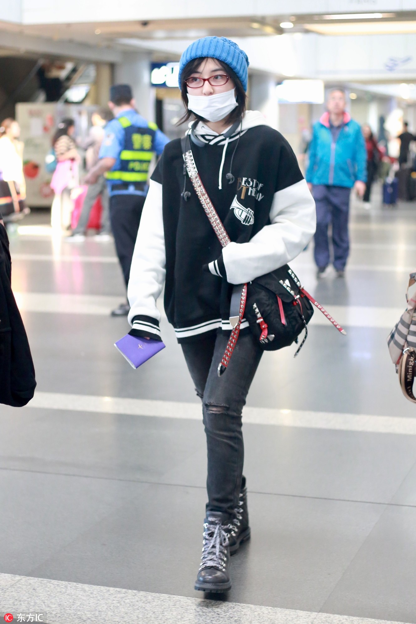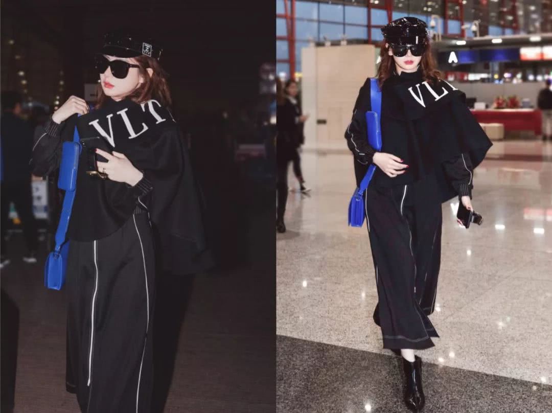 关晓彤现身首都机场,她头戴Vetements黑色棒球帽。