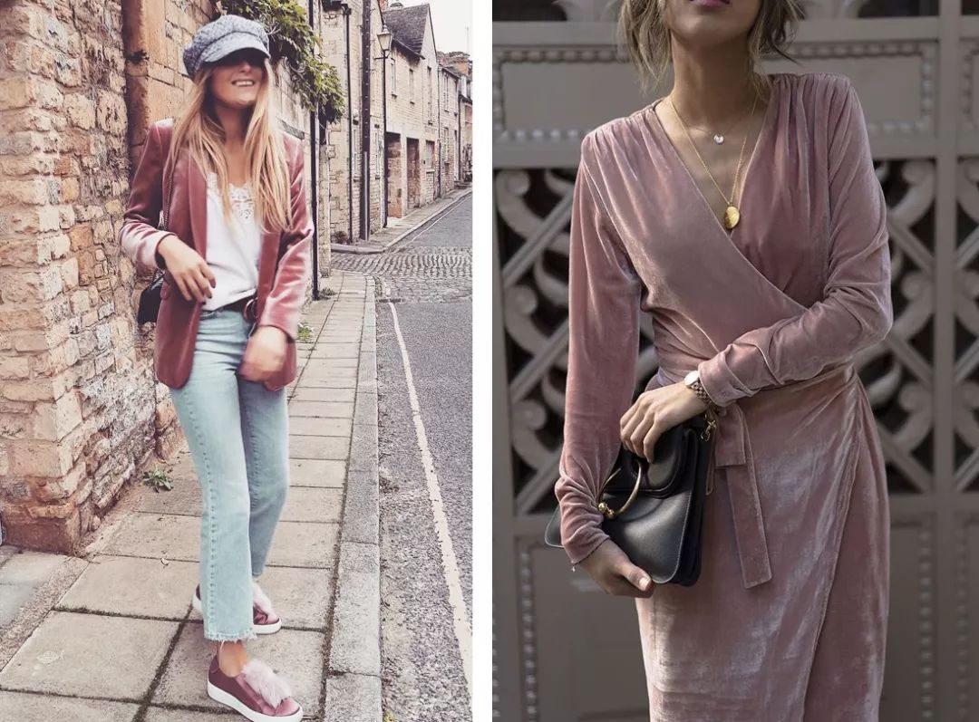 如果觉得丝绒元素的气质太成熟,不妨尝试时下最in的马卡龙色系丝绒单品,将贵气与少女感融合得很完美,年轻的女孩子驾驭起来也无压力。