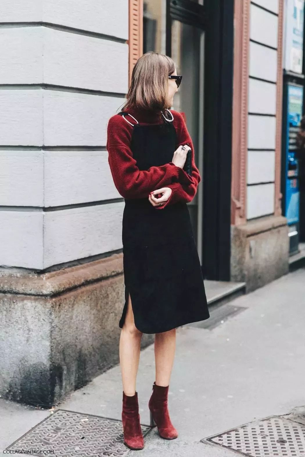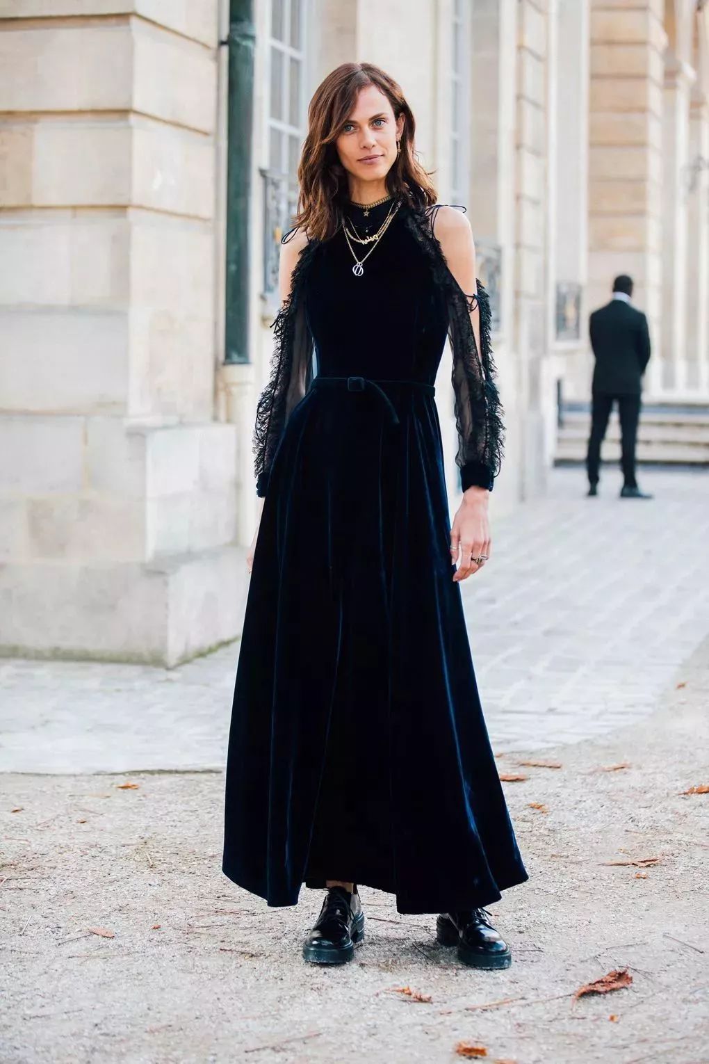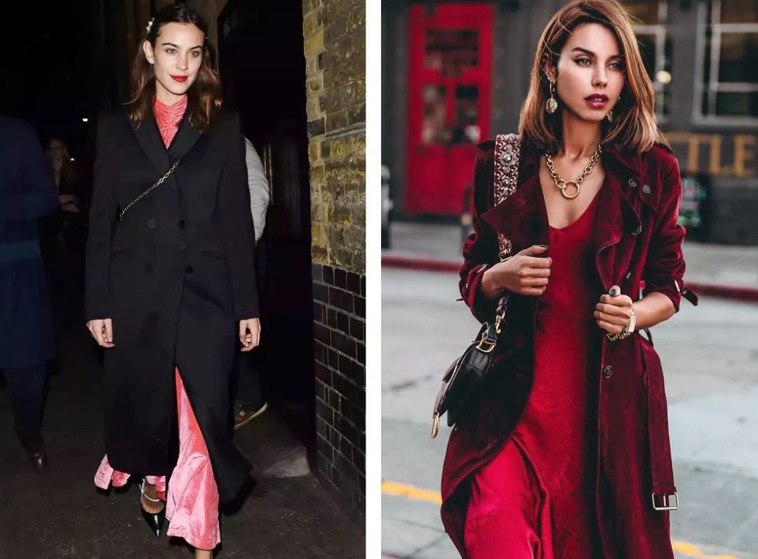 丝绒连衣裙穿在大衣外套里面也很好看,为你的大衣look更添几分精致女人味。