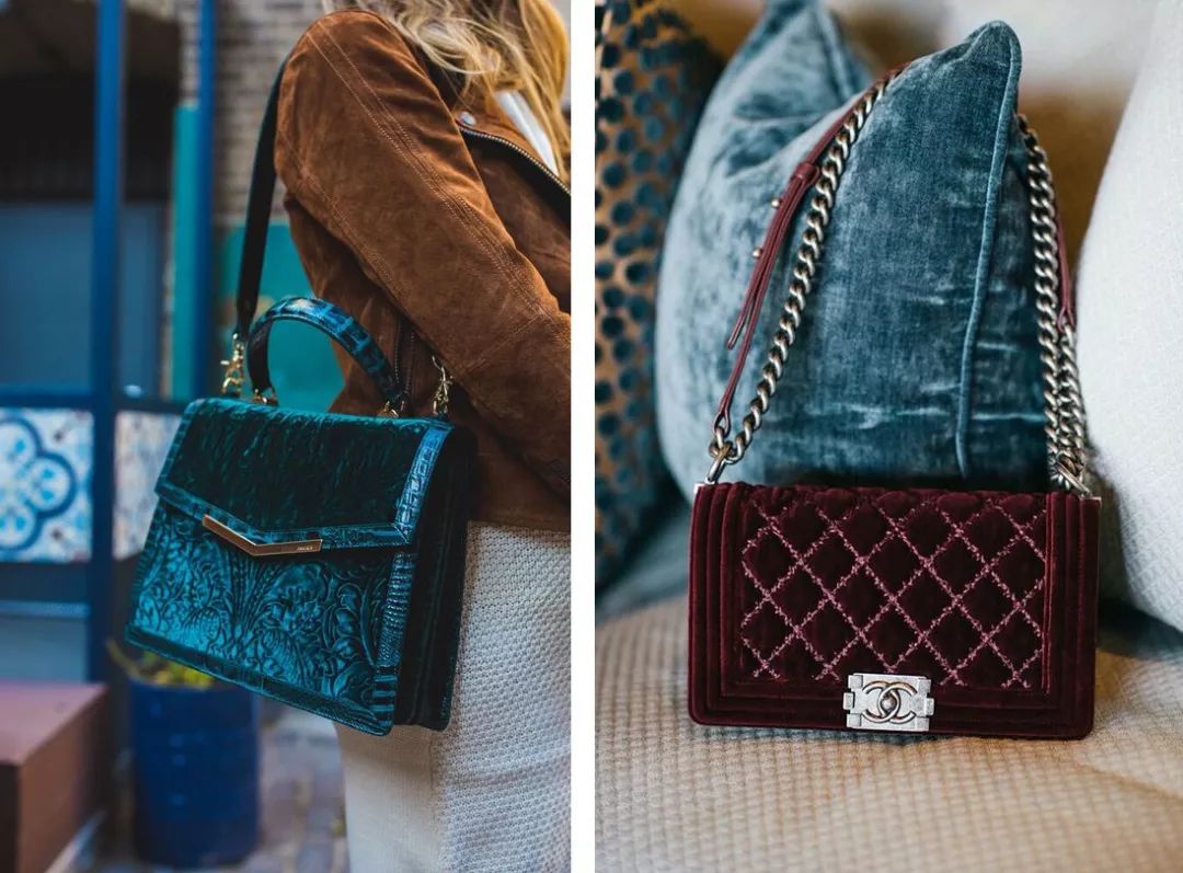 丝绒元素虽然都是偏华丽的风格,但不同颜色所呈现出来的气质往往也不同。一般来说,深色系的丝绒单品会更优雅大气 ,在重要的场合镇场子选它准没错。