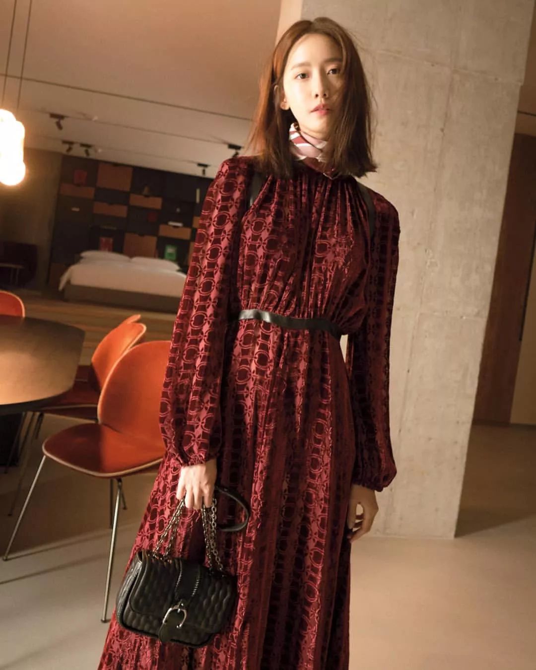 丝绒元素本身就足够有存在感了,因此其他的单品就不需要太过繁复了,简约的搭配更能让你的造型主次分明,彰显出丝绒自带的高级感。