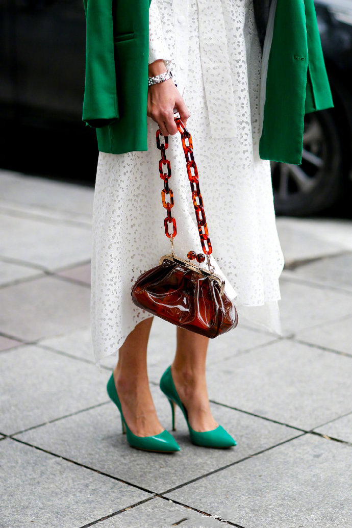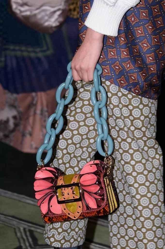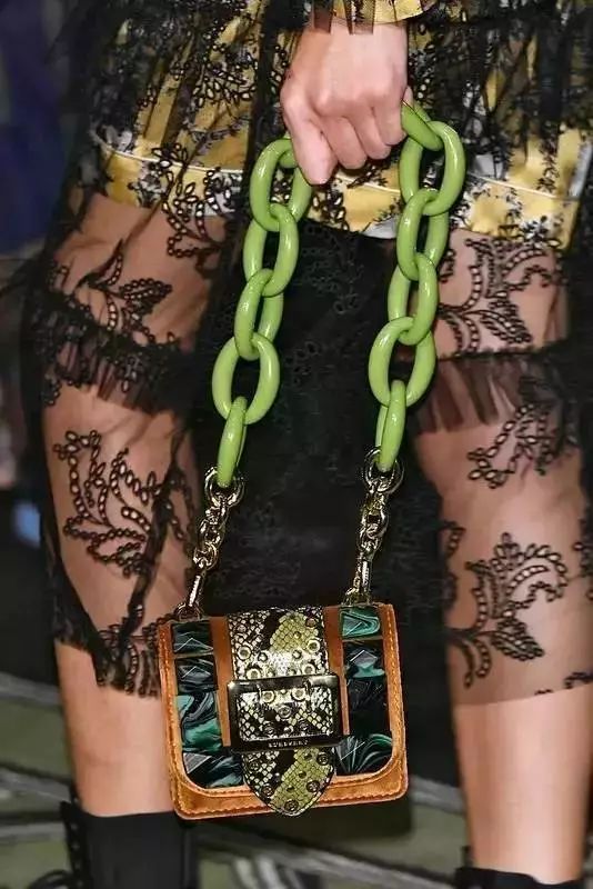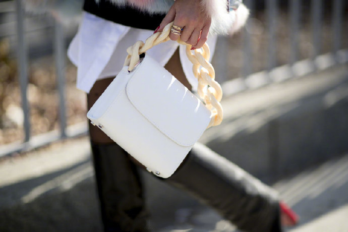 有链条包的人应该都会有这个感受,就是链条太重。所以呢很多聪明的品牌,为了改善这一困扰,又可以增加设计上的亮点,把粗链统统改成了塑料版,连价格都便宜很多,而且塑料可以作出很多种颜色,对于黑白灰的冬天,这个手柄真的不要太好看哦。