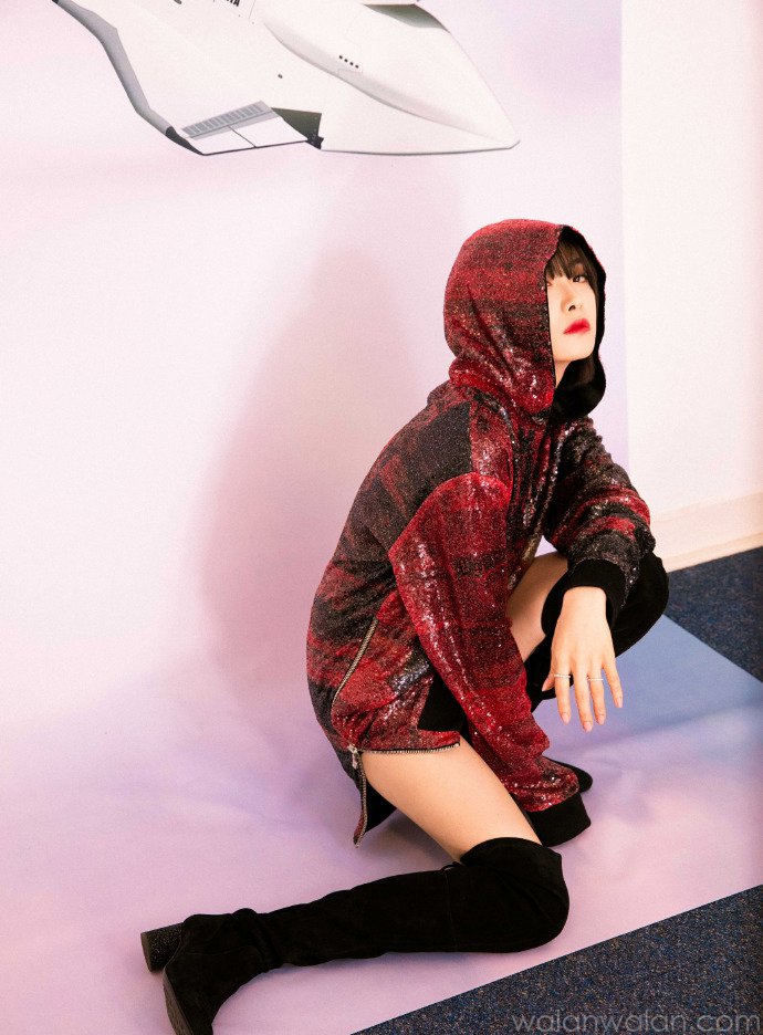 宋茜一袭Balmain2019春夏系列闪耀亮相,闪烁红色光泽的oversized亮片连帽衫搭配过膝长靴,性感迷人,光彩夺目自带kirakira效果~