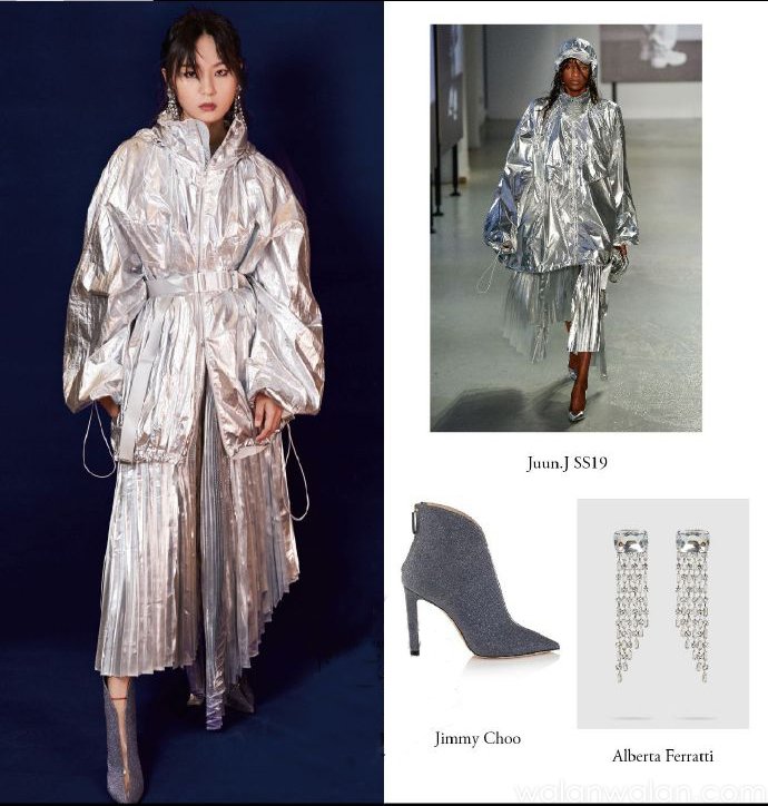 鹿晗身穿CELINE BY HEDI SLIMANE登上浙江卫视跨年晚会,银色拉链外套未来感十足,同时搭配黑色九分裤和小白鞋精致又帅气。