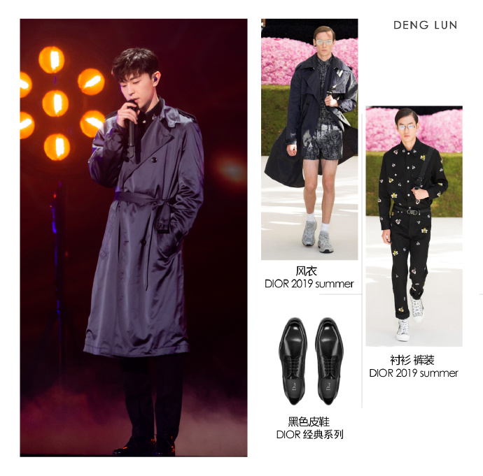 邓伦现身2019东方卫视跨年盛典,身着DIOR迪奥 2019 summer深蓝风衣搭配同系列色系印花衬衫高挑有型,上脚Dior 经典系列皮鞋沉稳利落,绅士风度尽显。