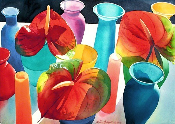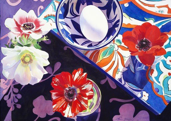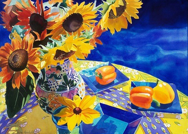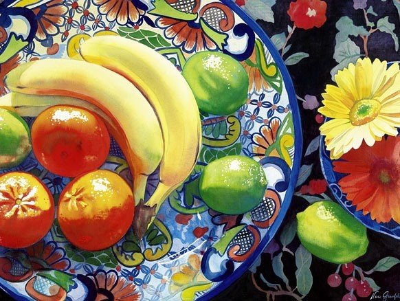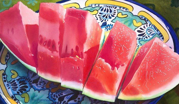来自美国艺术家 Nava Grunfeld 的水彩作品 ,西瓜、哈密瓜、香蕉、柑橘,各式各样的夏季水果和花朵,营造一个极其舒适、惬意的夏季午后氛围。桌布、碗碟都被赋予了艳丽的色彩以及繁复、多彩的花样图案,更是将夏天的氛围推向极致。