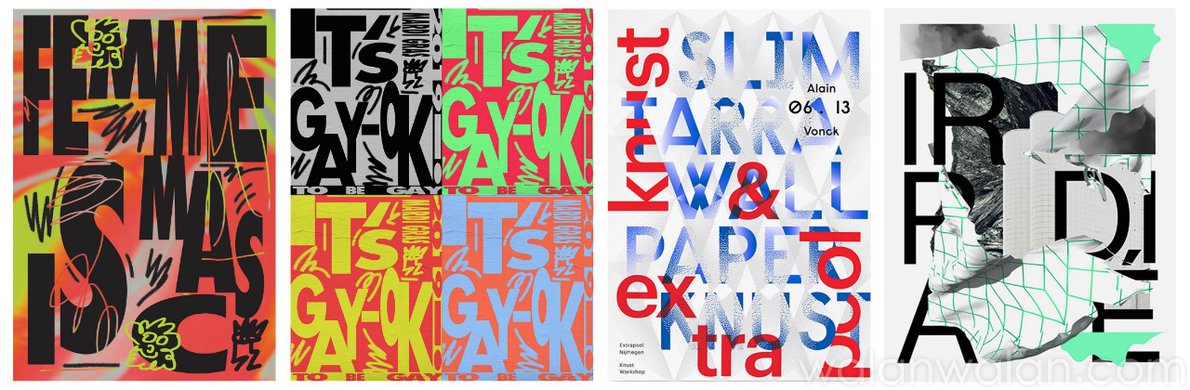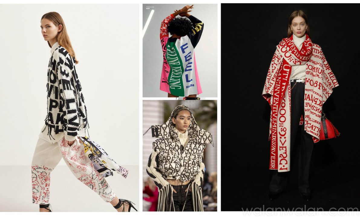 文字图案呈现出电脑编辑般的视觉效果。叠加、缩放、扭曲,通过文字呈现迷幻质感。可参考MSGM,将文字与渐变图案叠加,增强图案的视觉效果。该趋势同样适用于针织嵌花工艺,并可以尝试采用双色罗纹进行变化,参考Études和Stella McCartney。