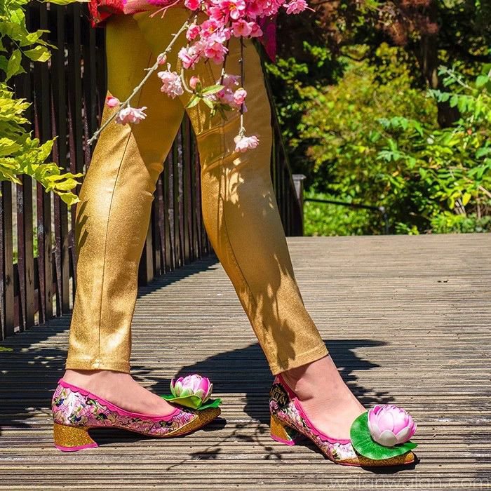 管方解读:当你穿着一双镶有睡莲边的中跟鞋时,你总能勇敢做自己。鞋面采用花木兰印花面料,上面点缀着圆点和花朵,鞋尖和鞋跟处点缀着精致的金光闪闪。每只鞋尖上都装饰着令人惊叹的粉色睡莲和睡莲花瓣。