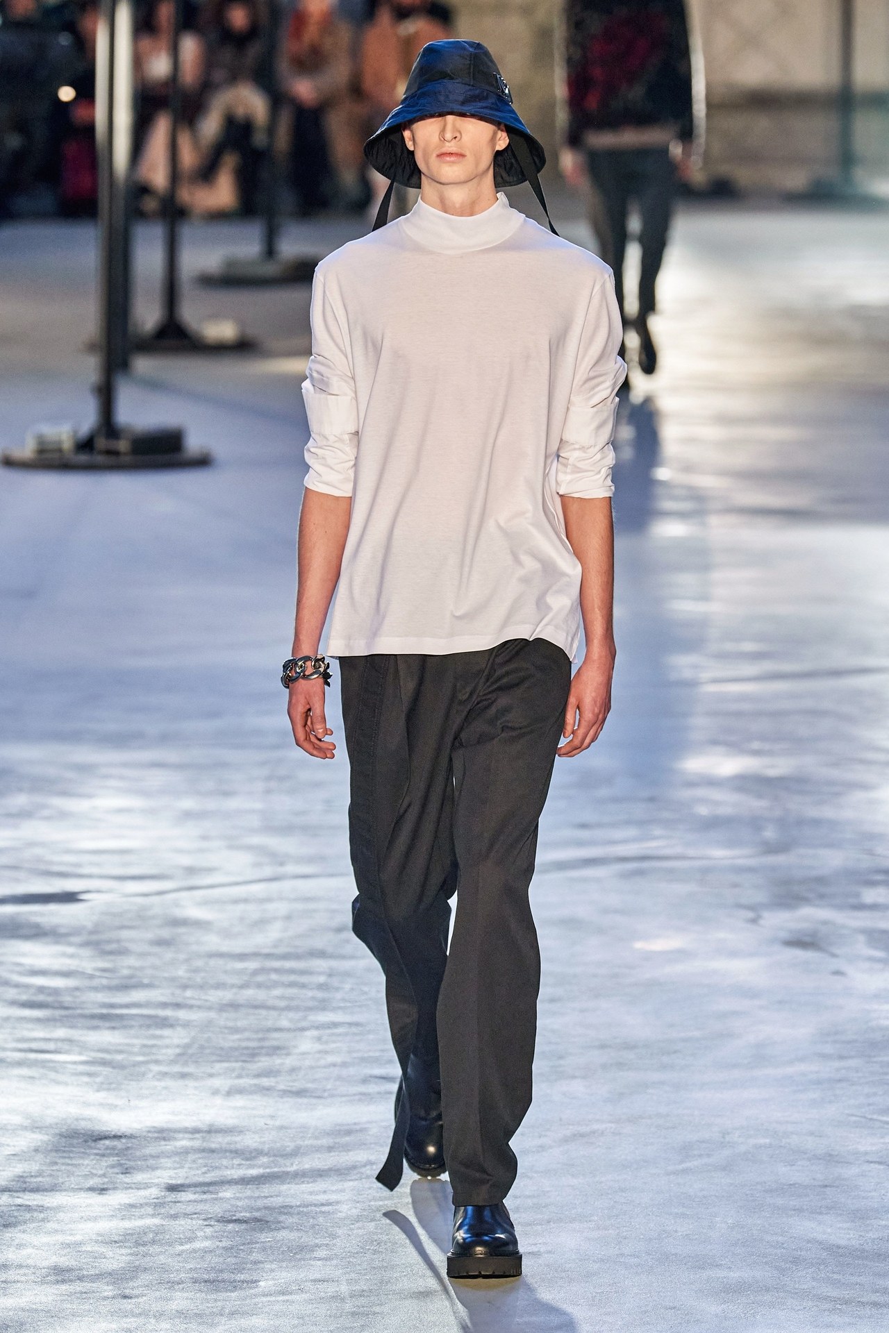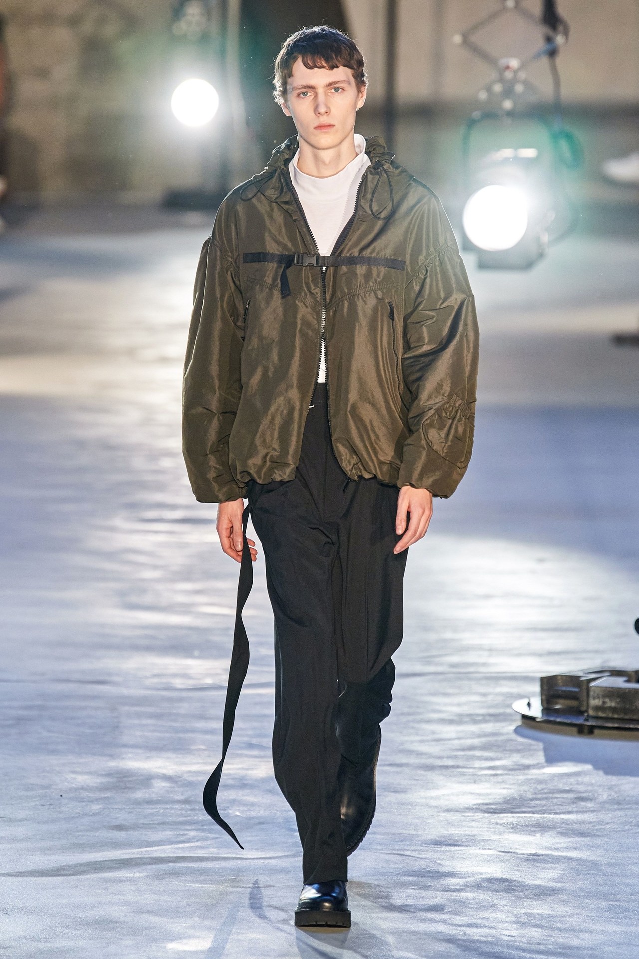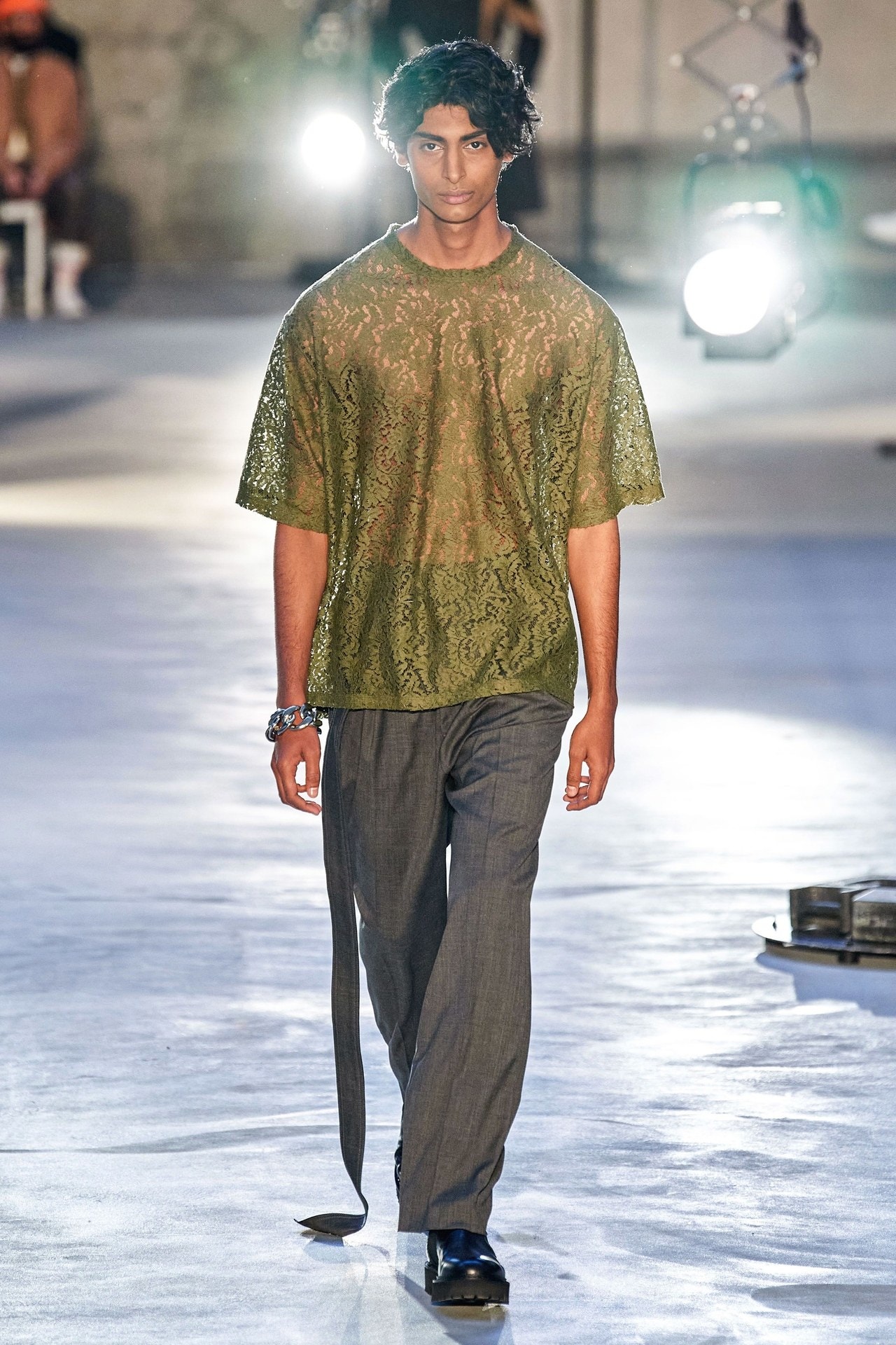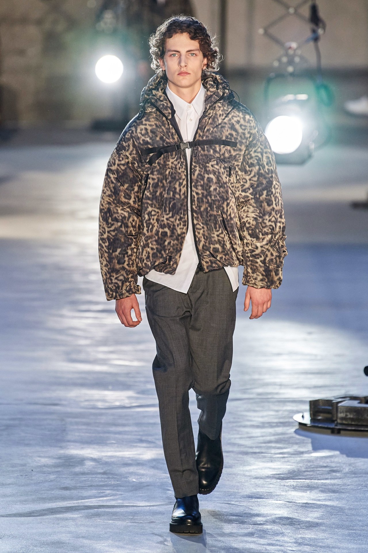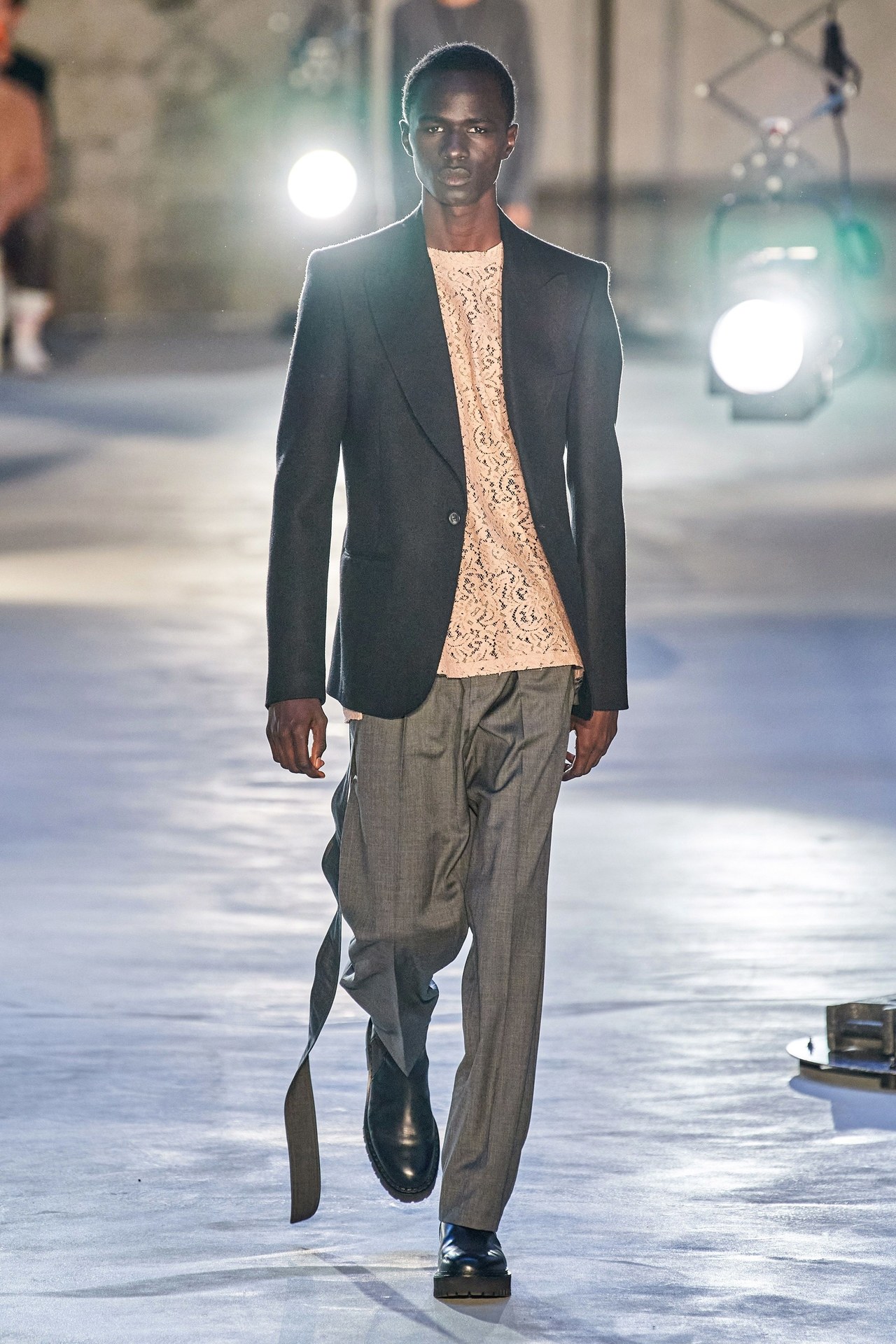 如今,每位男装设计师都在思考解决正装问题的新方法。Dell'Acqua的方法是为经典的衣柜订书钉赋予柔顺的边缘,以几乎女性化,柔和的氛围柔化西装外套,汽车外套和技术外套的阳刚姿态。一个很好的例子是穿着透明蕾丝T恤衫,松紧的grisaille裤子或在搭配宽领夹克的优雅西装下穿。正如设计师指出的那样,通过使用男装中不常见的珍贵面料减轻了厚实的派克大衣和轰炸机的实用运动风,例如松脆的迷彩式罗缎中式衬衫,“通常可以修饰女性的高级定制调料”。它做出了柔和而有说服力的规则转换手势。