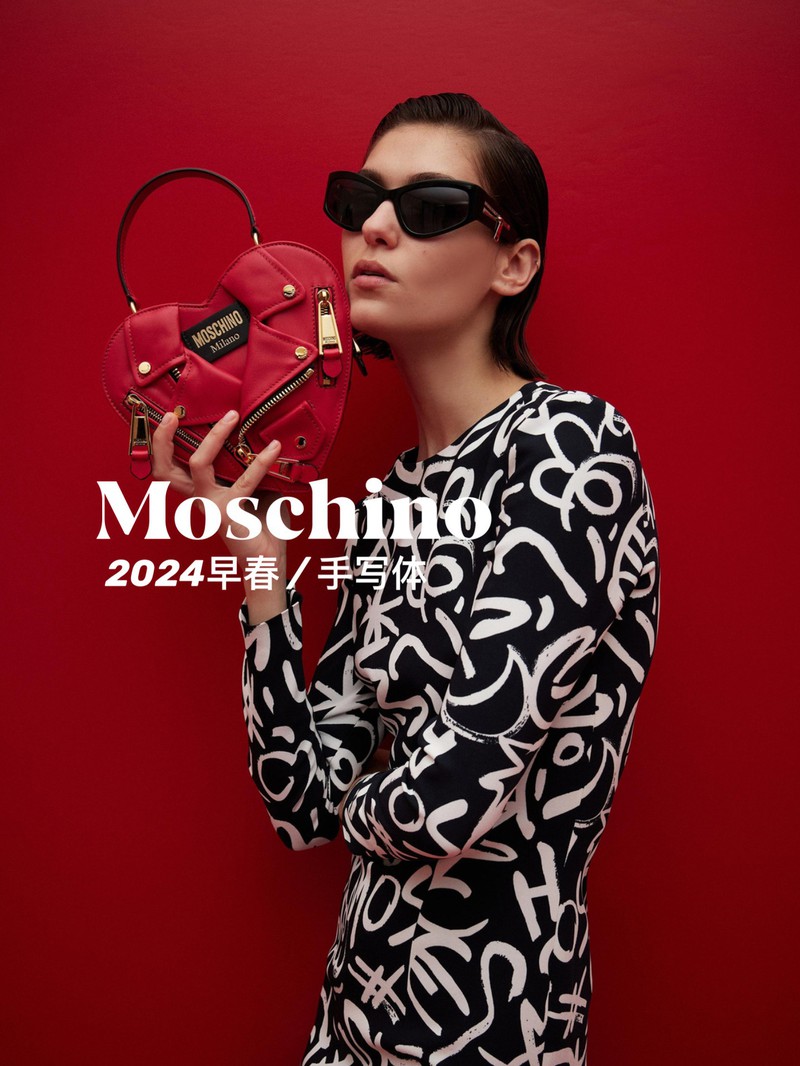 带点肌理感的手绘笔触是未来的图案趋势,在本季Moschino的2024早春系列中,我们看到了手写体图案强大的表现力。白色、黑色、红