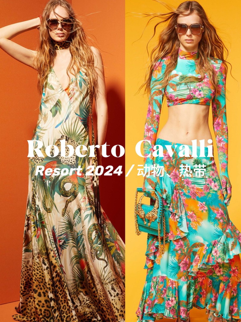 Roberto Cavalli 的标志性风格:20 世纪 70 年代的喇叭裤、皮革工艺和动物印花。在2024早春系列中,热带风情的