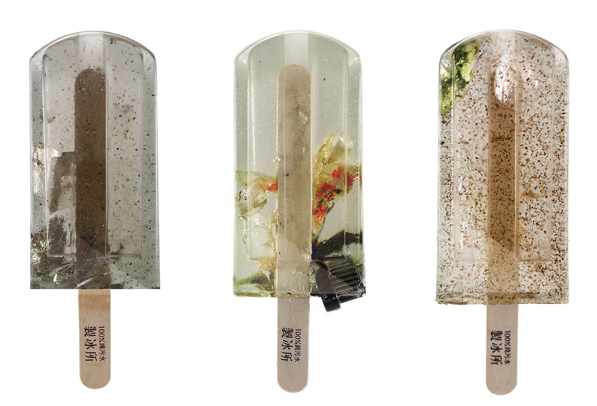 获奖作品“100%纯污水制冰所”(污水冰棒)是国立台湾艺术大学学生洪亦辰,郭怡慧,郑毓迪共同完成的毕业作品
