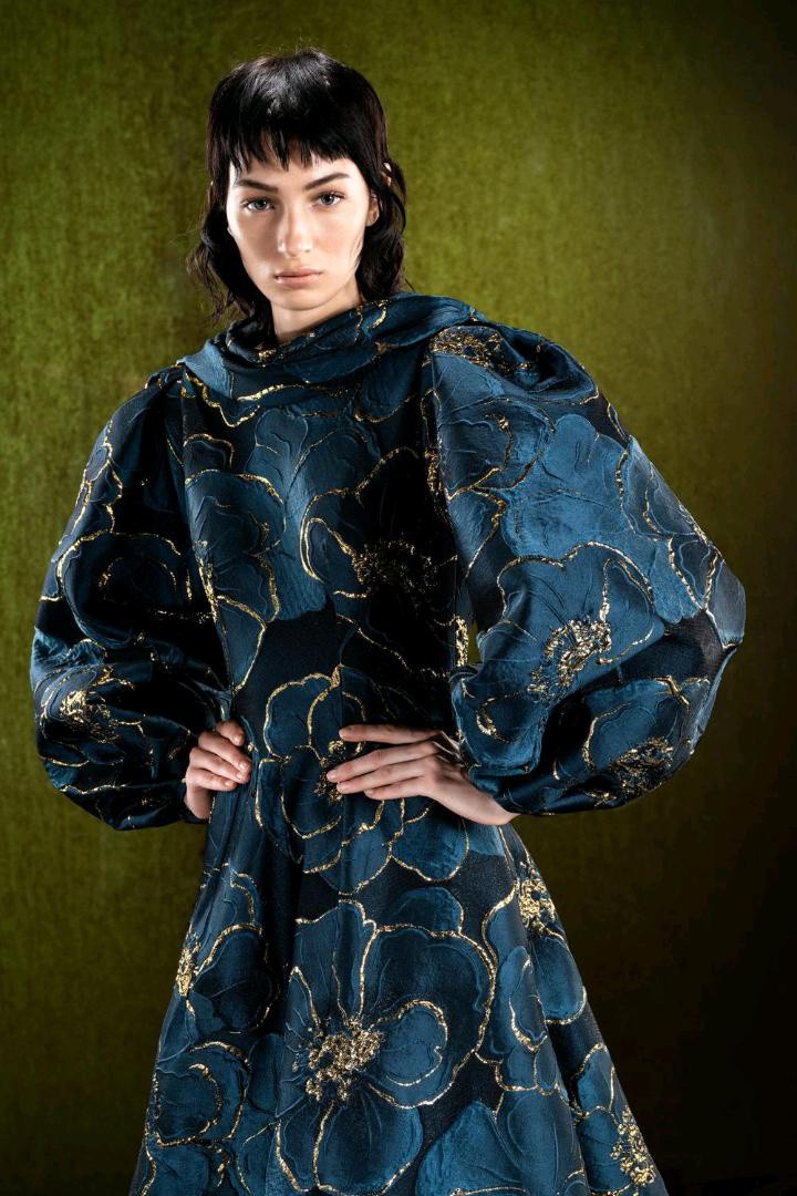 Reem Acra秋冬 2024 高级成衣轻纱上精致的绣花蔓延金边花朵在渐变深蓝色层叠墨绿色与红色暗纹花增加连衣裙的质感