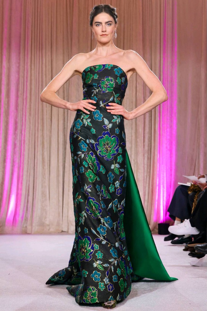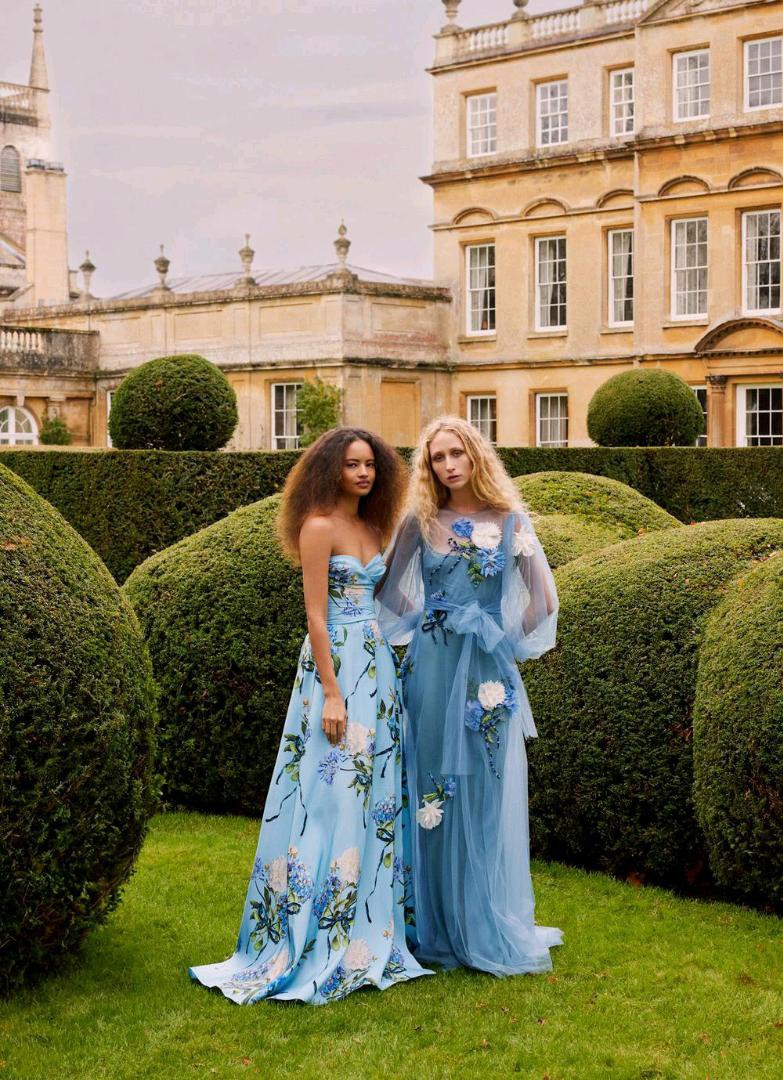 Monique Lhuillier秋冬 2024 高级成衣写实花朵的在嫩黄色水蓝色底色衬托下娇艳欲滴