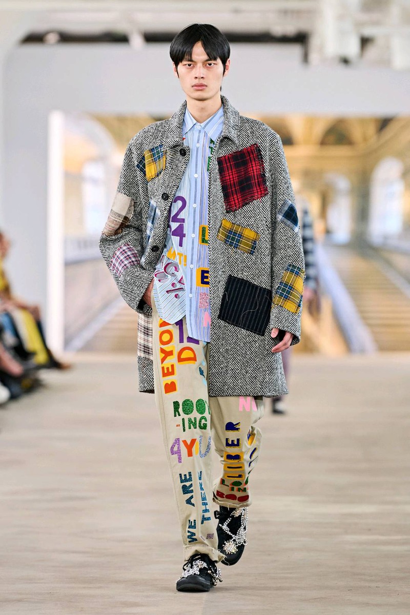 Libertine秋冬 2024 高级成衣各类主题元素拼接,各类风格集合到大衣中几何为基底叠加各色菱形格与彩色数字字母涂鸦风格趣味