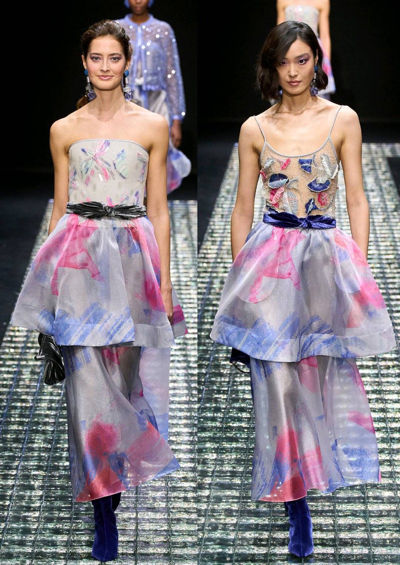 Emporio Armani秋冬 2024 高级成衣颜色绚烂的色块斑斓衬托纱裙星星月亮在黑色的衬托下耀眼多种几何图案与肌理在蓝色主