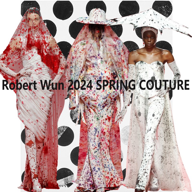 Robert Wun Spring/Summer 2024 Couture中血色的喷溅效果,灼伤焚烧效果,雪落下的效果中斑点肌理色