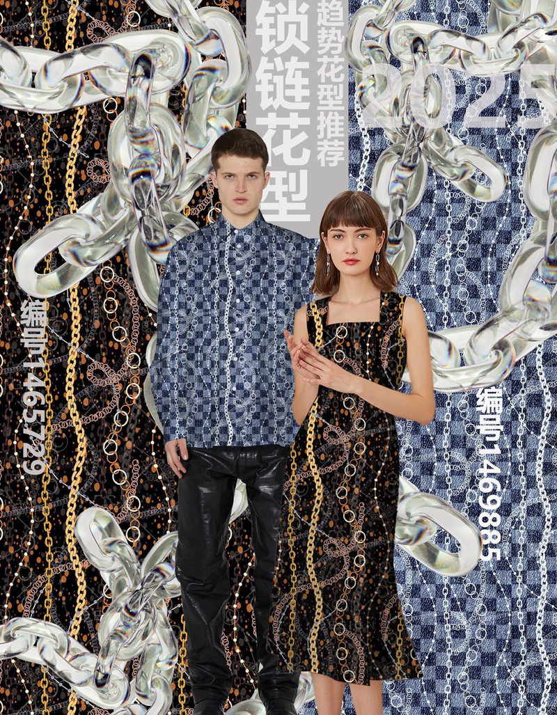 Versace RESORT 2025男女装中锁链元素夺人眼球锁链元素以各种形态与花卉几何等元素的结合增加了服装的精致高级感快来看