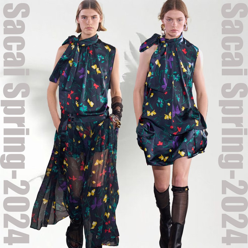 Sacai Spring  2024中蝴蝶与花卉在纱裙上缤纷飞舞,快来看看这些蝴蝶与花卉的多样变换搭配吧