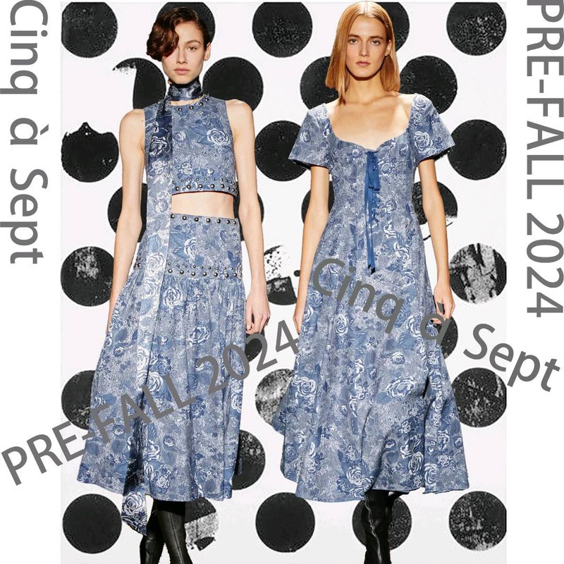 Cinq à SeptPRE-FALL 2024,牛仔布与花卉的结合增加服装复古感,牛仔与几何结合飒酷感十足,手绘花卉搭配绚烂的色