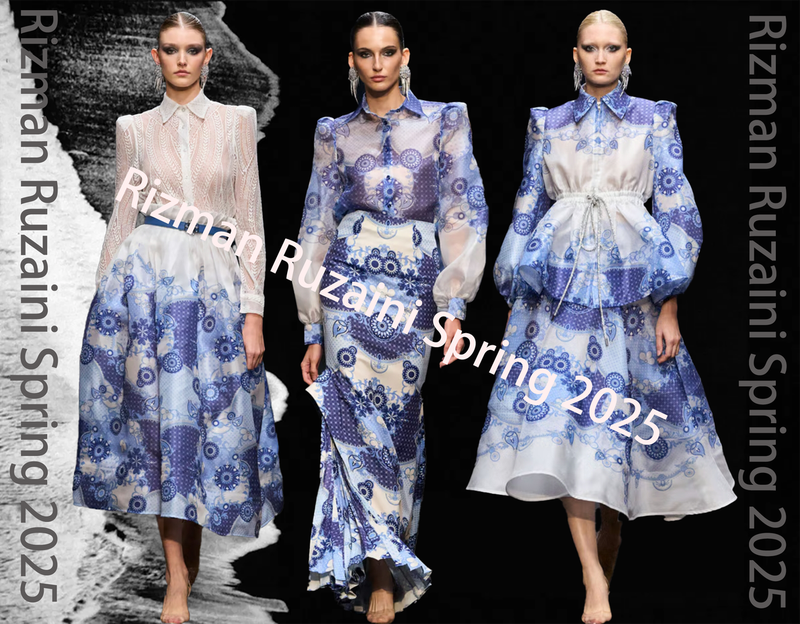 Rizman Ruzaini Spring 2025 圆圈为主体的几何采用蓝色系精致淡雅,深灰色的大理石肌理与白色使得裙装格外高级