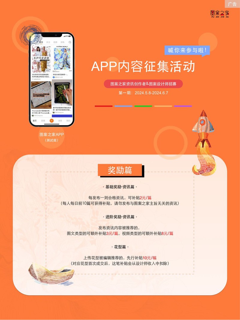 欢迎成为图案之家的第一批内容创作者和图案设计师,活动期间发布资讯和上传华亿平台都能获得相应的奖励,更多内容请看图片~
