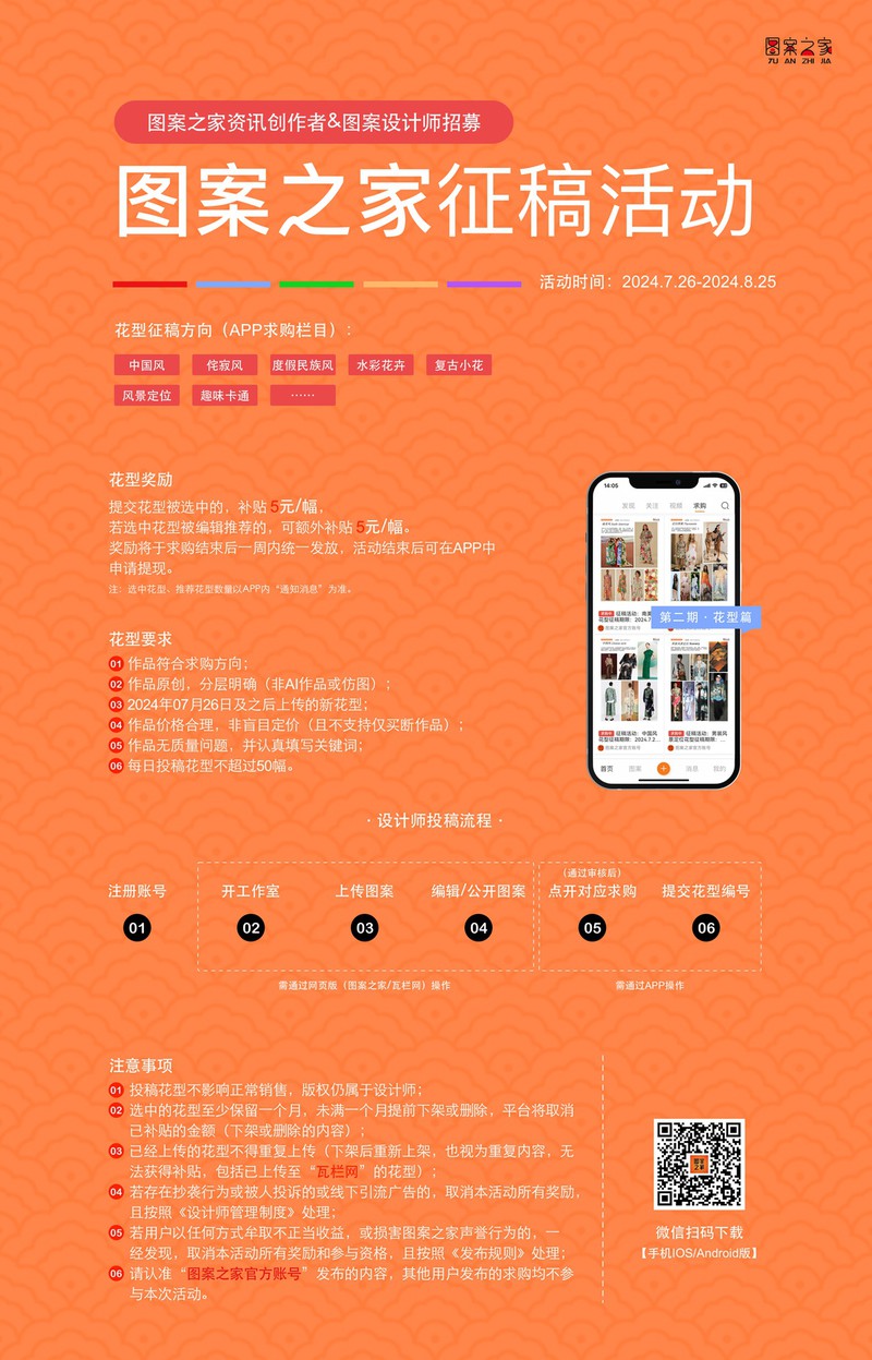 图案之家征稿活动第二期·华亿平台篇欢迎成为图案之家的内容创作者和图案设计师,活动期间上传华亿平台并投稿均有机会获得相应的奖励,更多事项请查