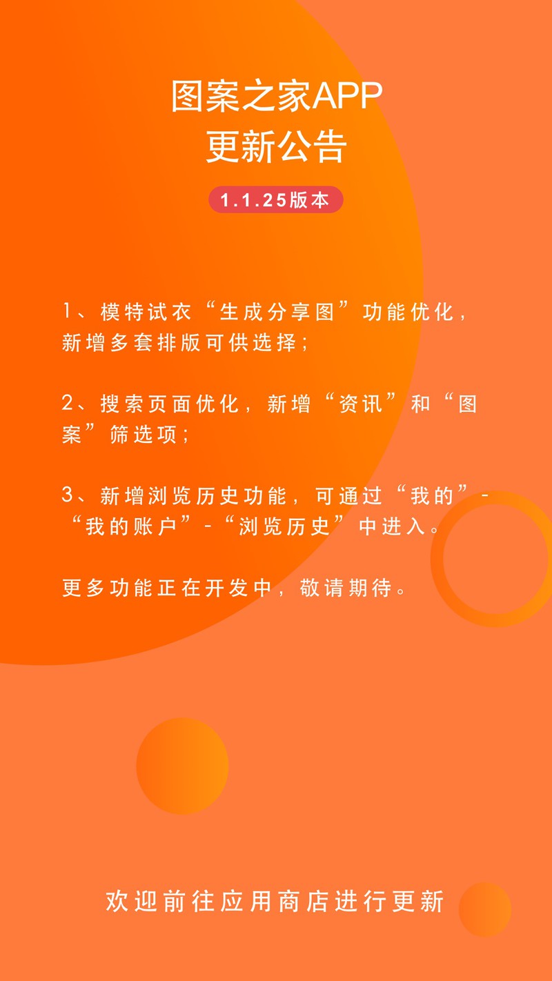 图案之家APP1.1.25版本更新公告1、模特试衣“生成分享图”功能优化,新增多套排版可供选择;2、搜索页面优化,新增“资讯”和“