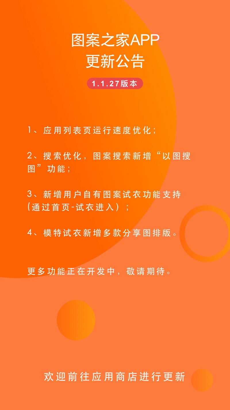 图案之家APP1.1.27版本更新公告1、应用列表页运行速度优化;2、搜索优化,图案搜索新增“以图搜图”功能;3、新增用户自由图案