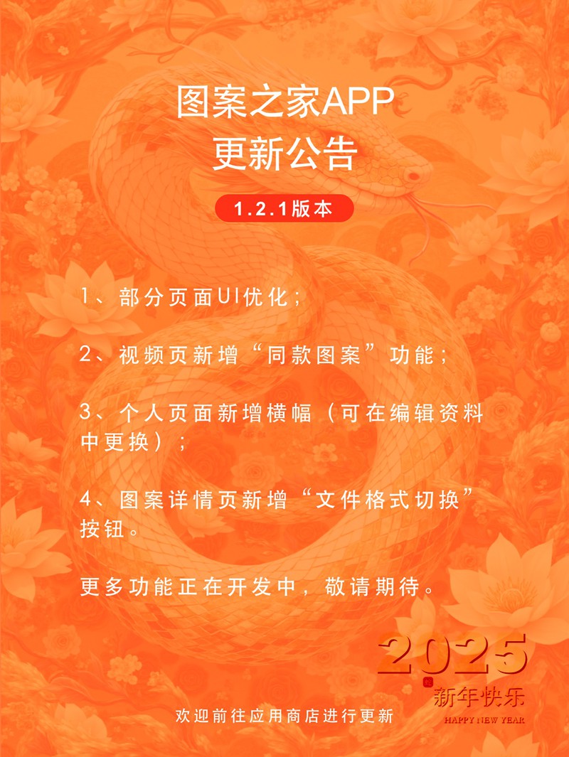 图案之家APP1.2.1版本更新公告1、部分页面UI优化;2、视频页新增“同款图案”功能;3、个人页面新增横幅(可在编辑资料中更换