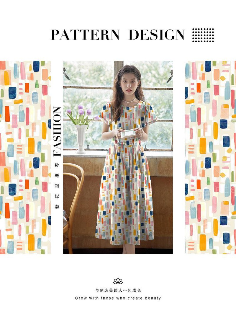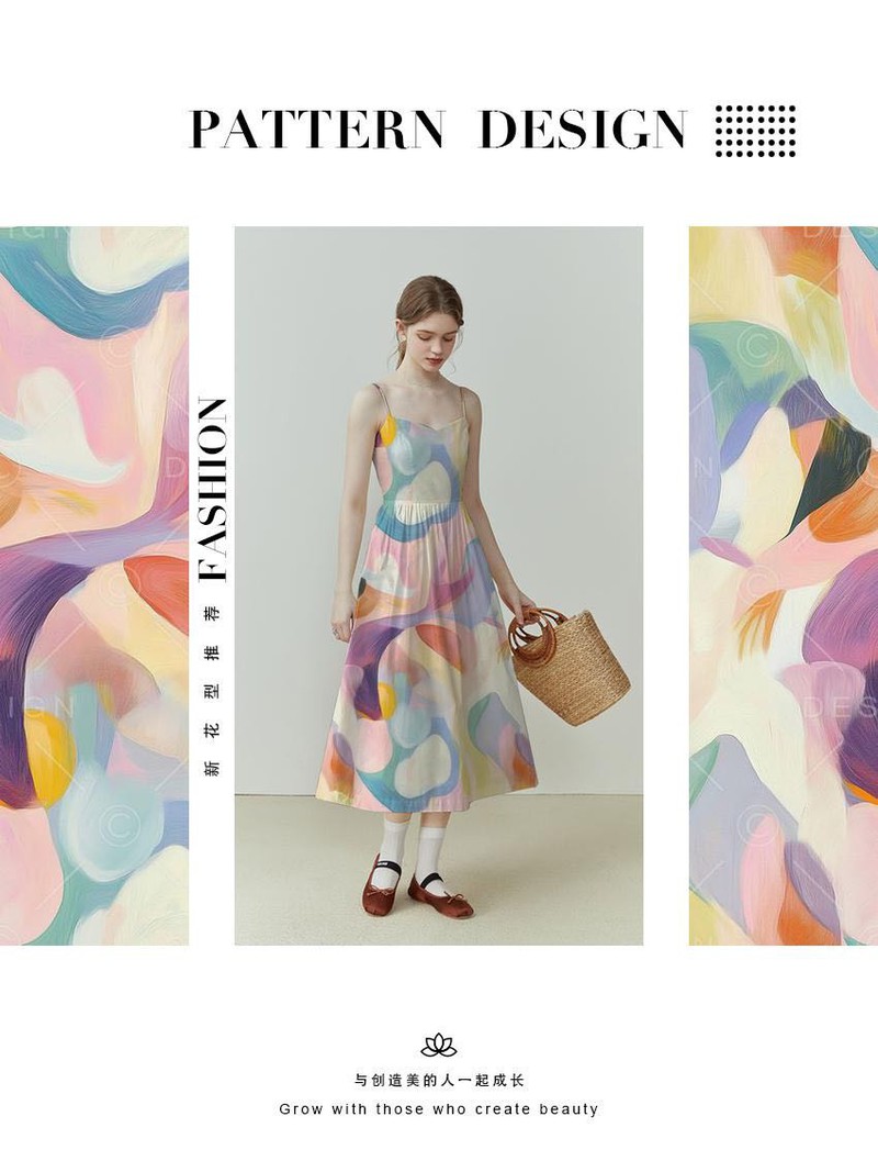 似梦幻笔触轻触织物,斑斓色彩肆意交融,流淌出独有的艺术情韵,着身即携诗意画卷同行