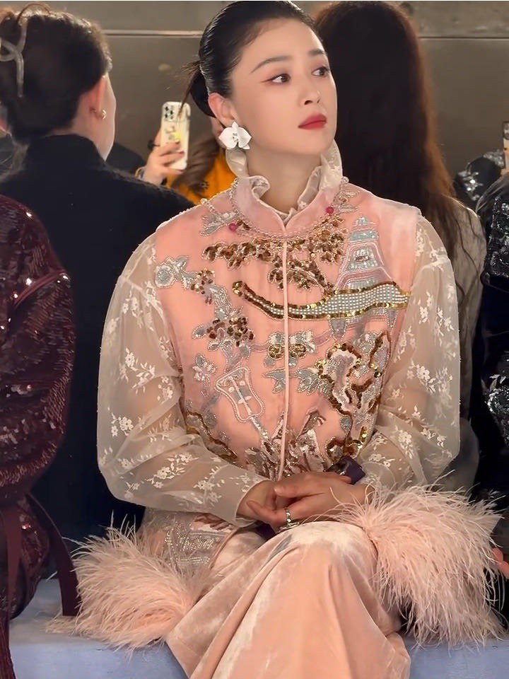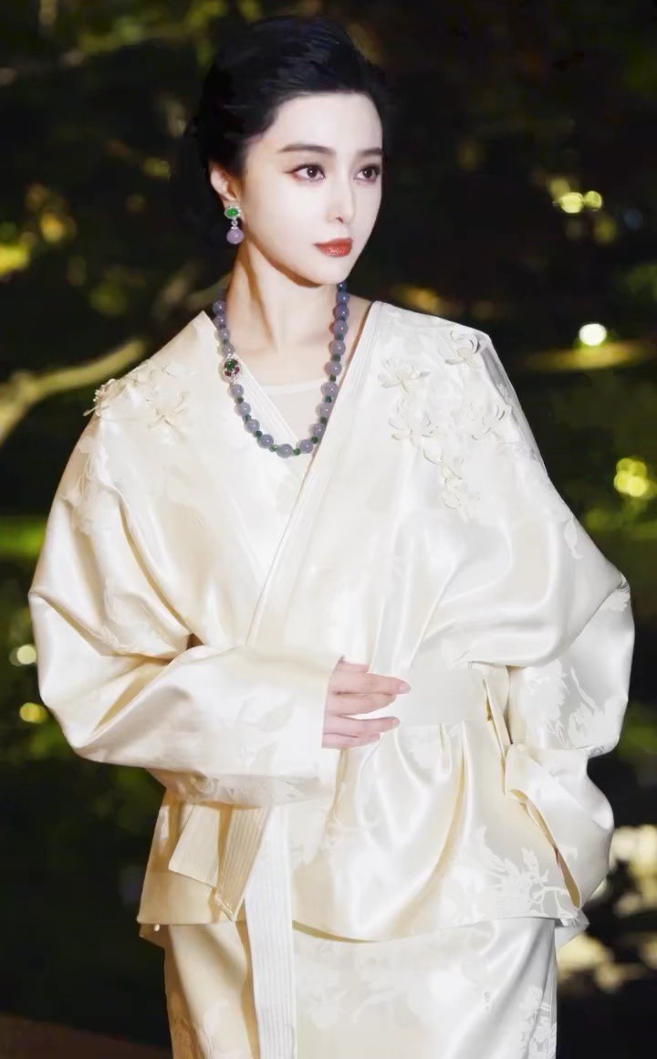 冰冰姐演绎MESSENTIAL 2025秋冬系列素馨花立体钉珠装饰玉色提花新中式套装,古韵与摩登交织,尽显东方式的典雅风骨。美人配